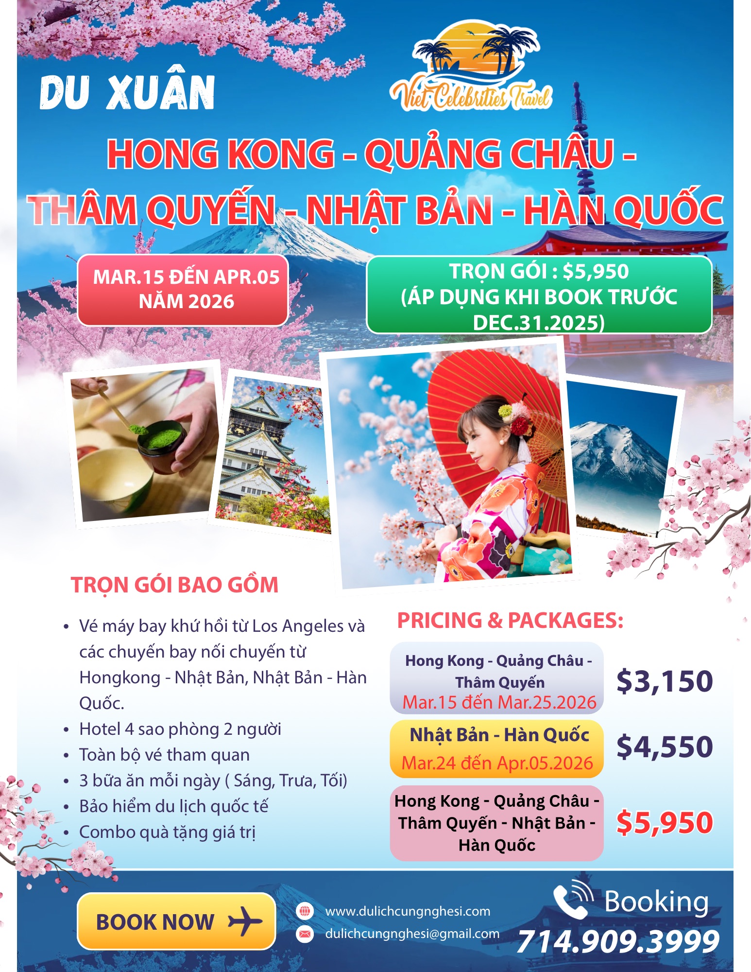 Giá trọn gói chỉ: $5,950 ( Giá áp dụng cho khách book trước 31/12/2025 Khởi hành từ LAX, các tiểu bang khác giá sẽ thay đổi tuỳ thuộc vào giá vé máy bay)